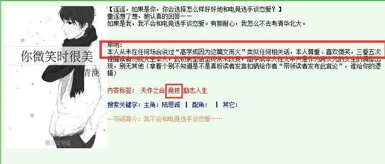 例如小说标题“你微笑时很美”,是为中国捧回首个LOL世界冠军奖杯的前WE战队职业选手高学成(微笑),曾经使用过的游戏ID。这一ID源自他和前女友苏小妍的故事,进而导致部分电竞粉丝最初以为小说本身是写高学成和苏小妍。