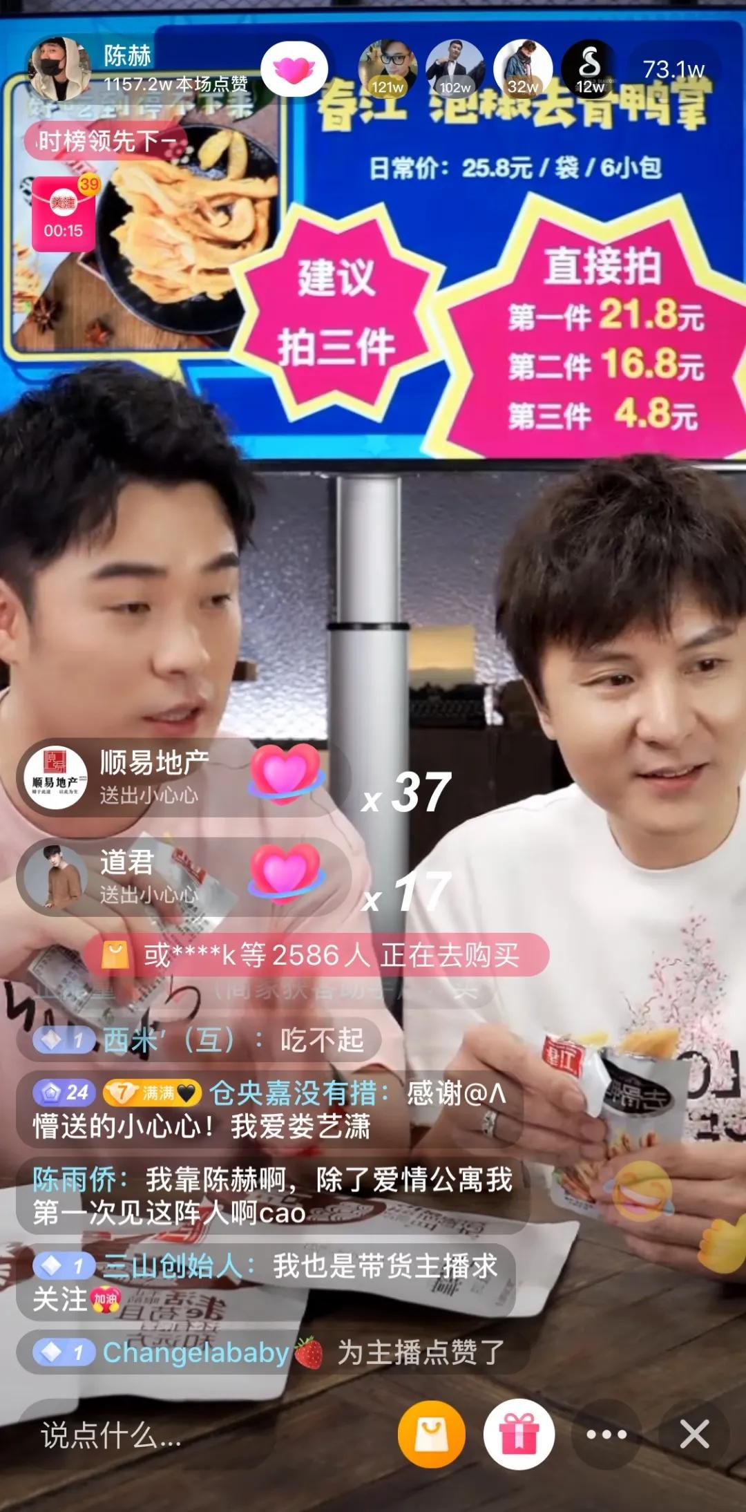 这是一场从流程设计和节奏把控都经过精心设计的首秀。开场以1元限量秒杀的春江海带调动观众积极性,设置“有东西,上链接”为抢购口号,适时穿插现金与礼物抽奖。陈赫与朱桢对吆喝卖货的适应程度,比已经直播一个多月的老罗还要得心应手。