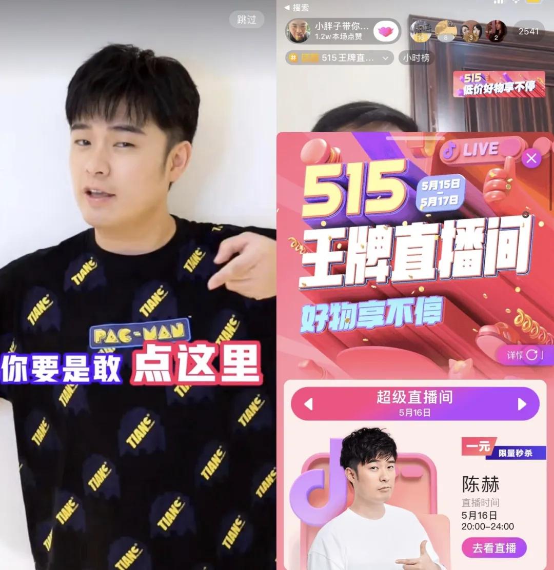 为其直播首秀精心准备的还有抖音。除了让两大“带货顶流”频繁互动营造比拼感,今晚的抖音也用开屏广告、信息流广告为陈赫引流,并在“515王牌直播间”活动页面为他开辟了“超级直播间”入口。上一个拥有该入口的主播是周五开播的老罗。
