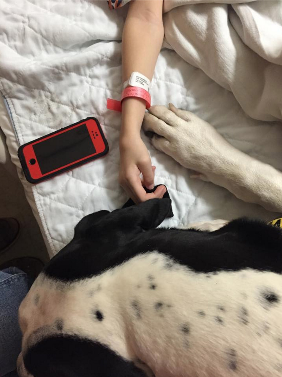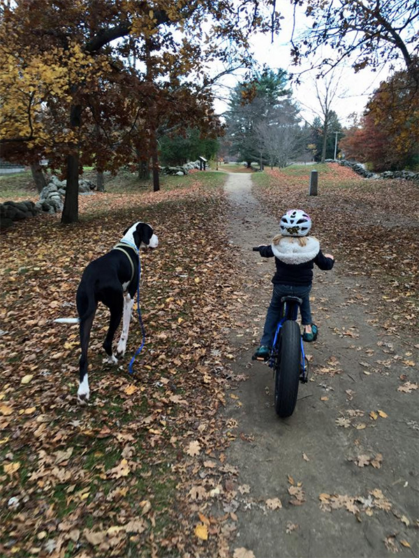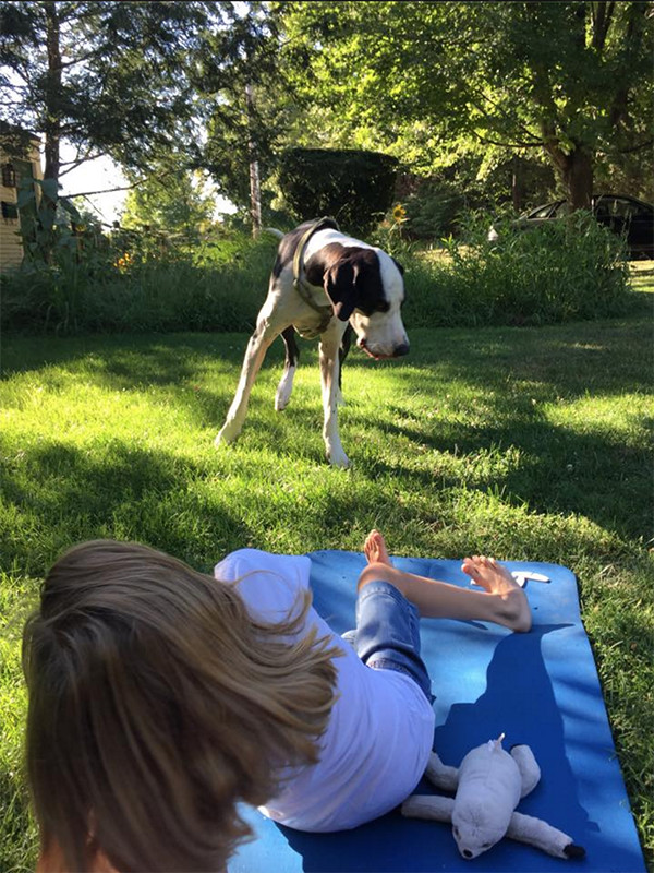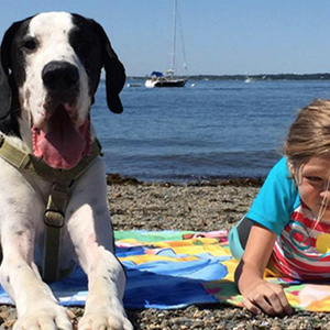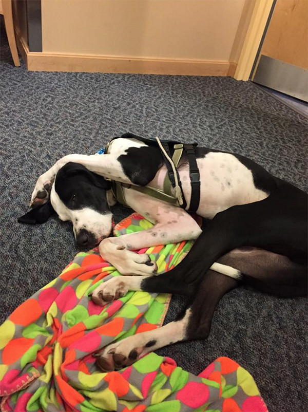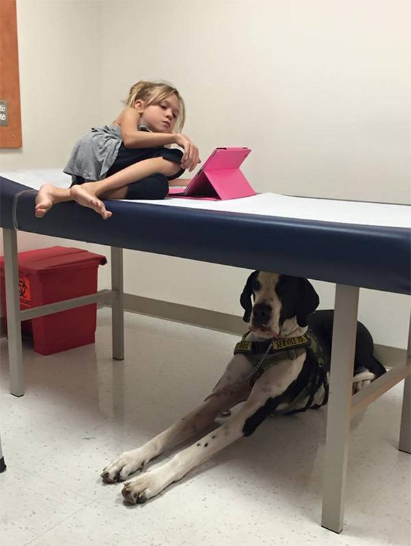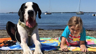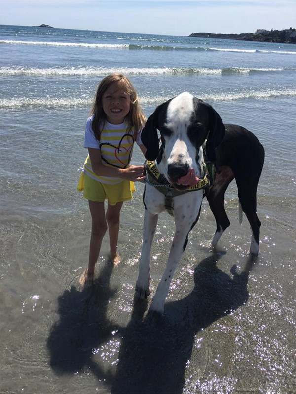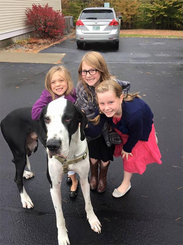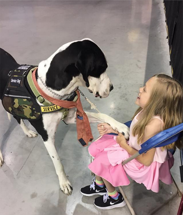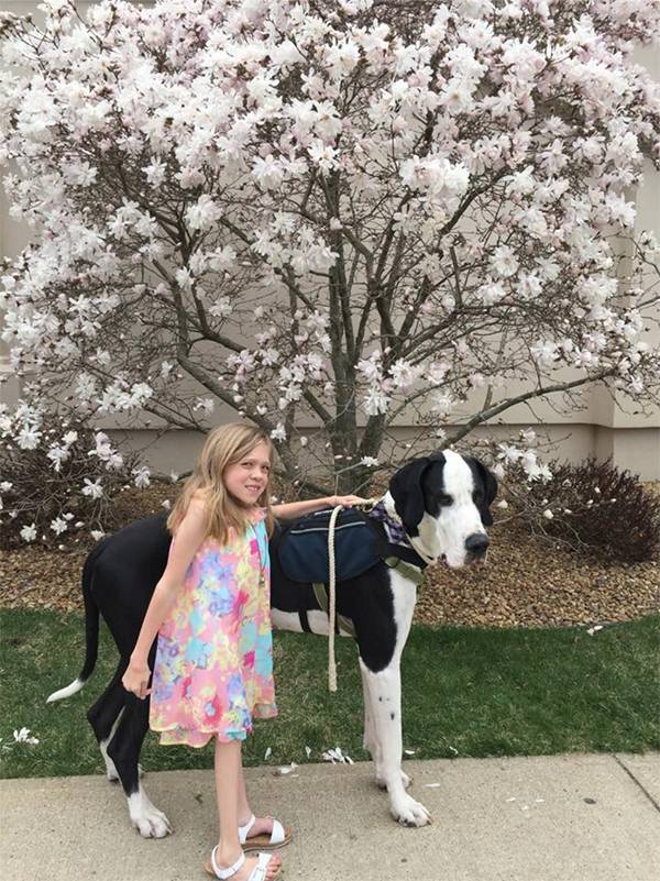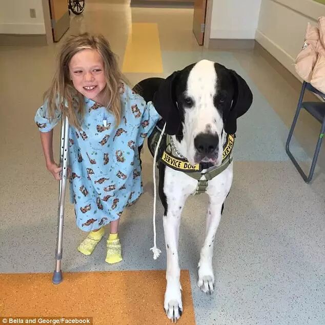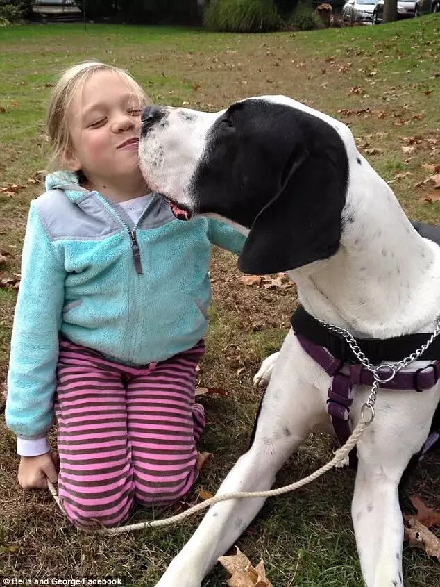 美国伊普斯维奇市的“服务犬计划”已经向行动困难人群捐赠了100多只大丹。George体重近120斤,是Bella的三倍,身高则与Bella相近。像所有被捐赠的大丹一样,George刚与Bella匹配,就进行了针对Bella的特别训练。