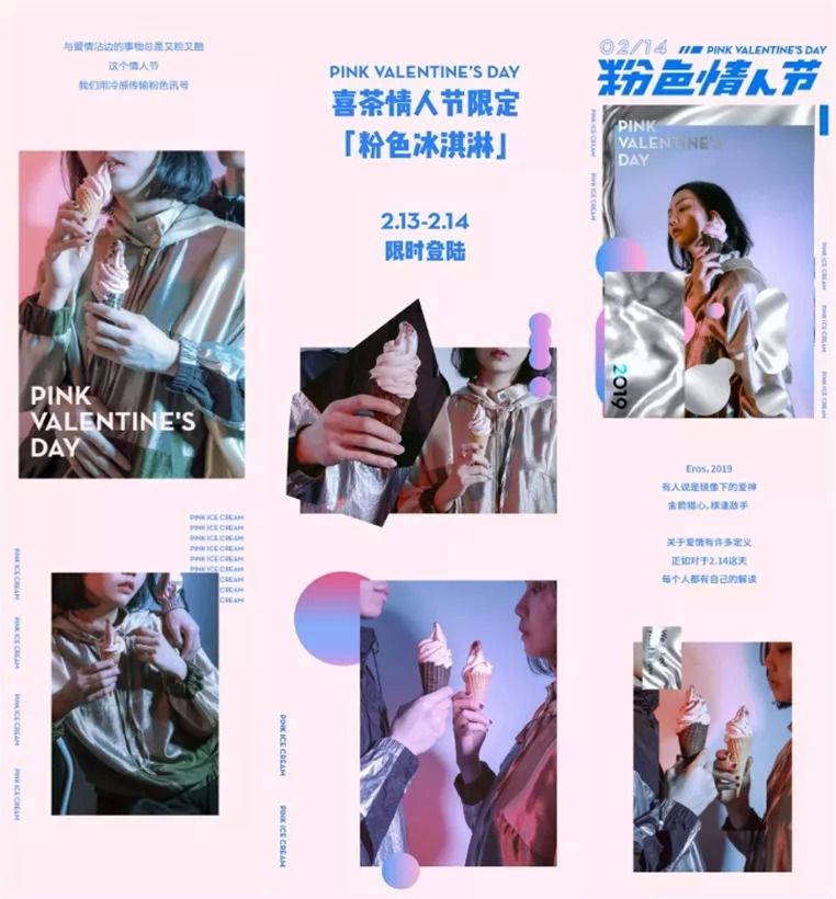 星巴克每年都会推出情人节限定特饮,喜茶去年也推出了情人节限定“粉色冰淇淋”的活动,时间为2月13日~2月14日,粉色的主色调很符合情人节的浪漫氛围。