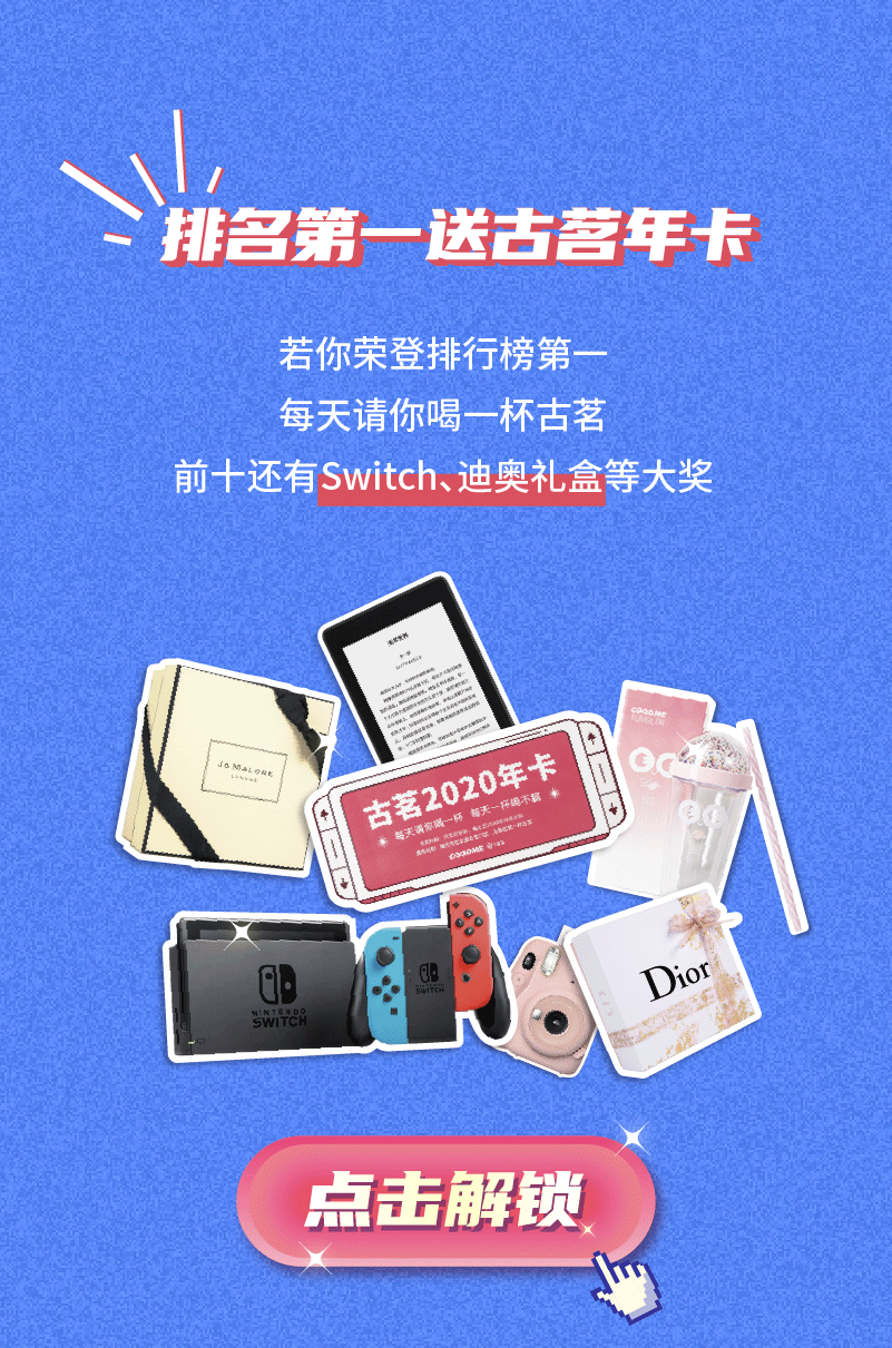 顾客参与游戏,即有机会获得各种专享优惠券。另外会根据游戏成绩,排名第一送古茗年卡,排名前十还有Switch、迪奥礼盒等大奖。游戏中还可以通过集齐道具兑换古茗定制水杯。