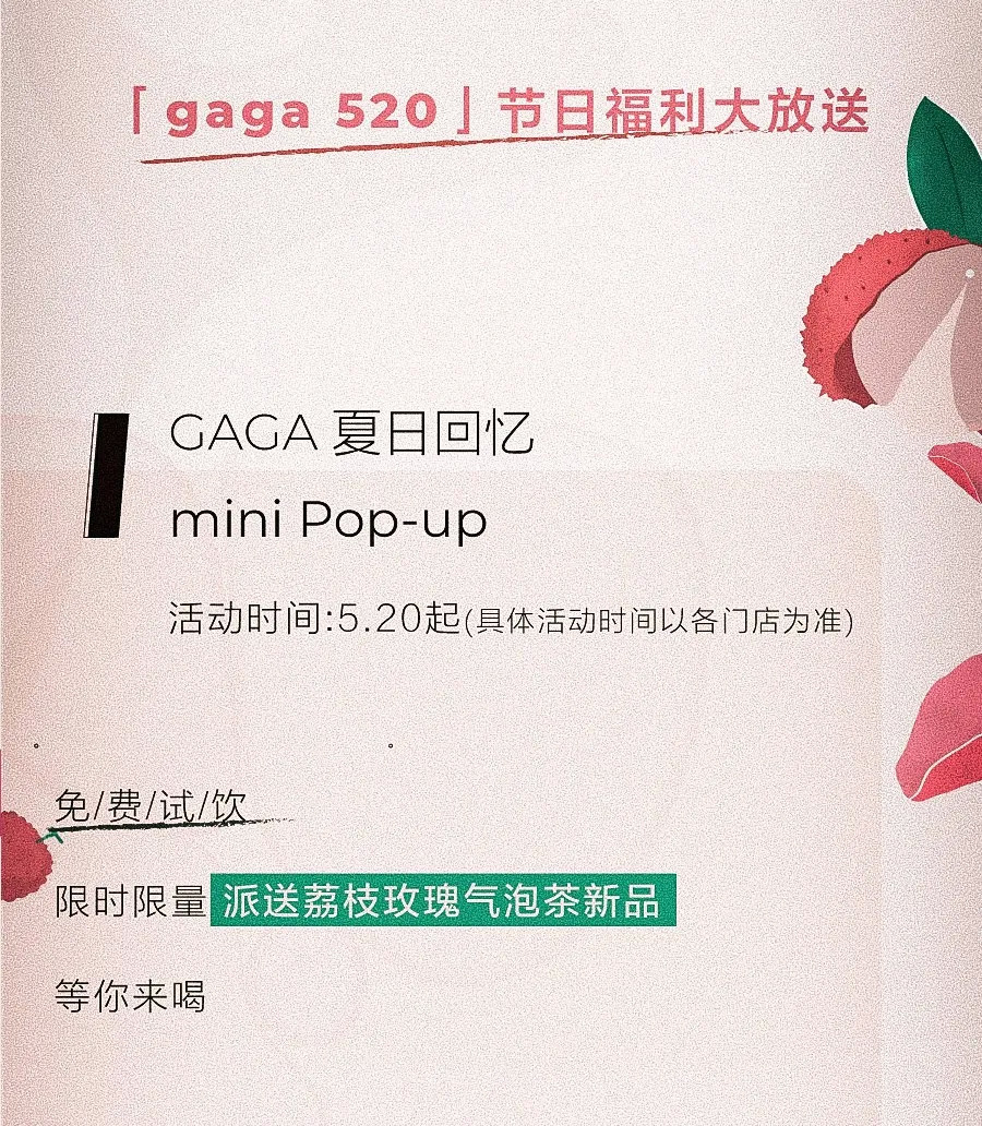 gaga在今年的520推出了免费试饮新品“荔枝玫瑰气泡茶”的活动。还推出了线上小游戏,扫码即可参与,还有限量新品福利。