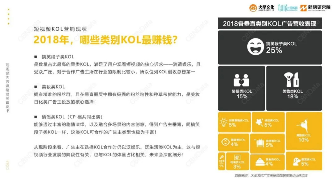 情侣KOL的吸金能力也很突出。《2019短视频内容营销趋势白皮书》显示,2018年情侣类KOL广告营收占所有垂类15%,仅次于搞笑段子、美妆类。