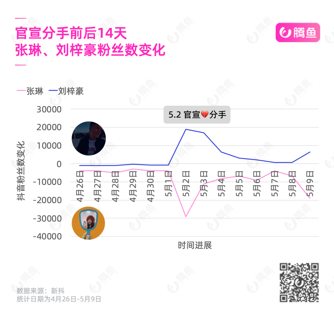 5月2日,粉丝超700万的抖音红人张琳与未婚夫刘梓豪各自发布分手声明,理由是女方陷入备婚阶段的焦虑,双方意识到彼此更适合恋爱,而不适合结婚。官宣分手后,张琳的账号单日减少2.9万粉丝,是近30天跌幅最大的一天,而刘梓豪的个人账号则迎来持续涨粉,最高涨幅为单日1.7万。
