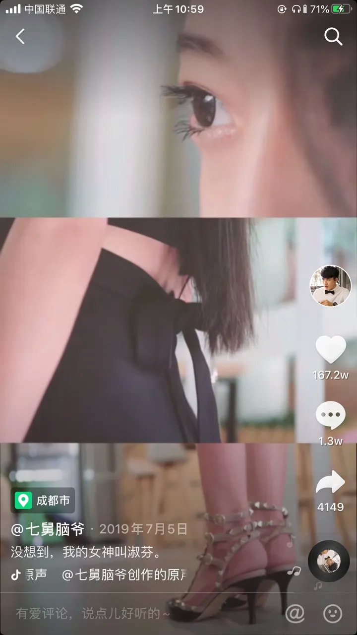 直到2019年7月,“七舅脑爷”在短视频中上演了与女神相遇的戏码,这位女神“赵兮雪”也是他现实生活中的真女友。
