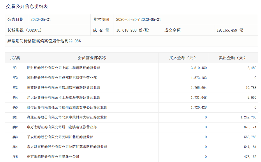 长城影视宣布成为“网红概念股”后,公司目前已收获两个涨停。根据深交所盘后数据,5月20日-5月21日,长城影视因异常期间价格涨幅偏离值累计达到22.08%登上龙虎榜,两日成交金额达1916.55万元,登榜的除卖五申万宏源证券有限公司青岛分公司外,全为游资席位。
