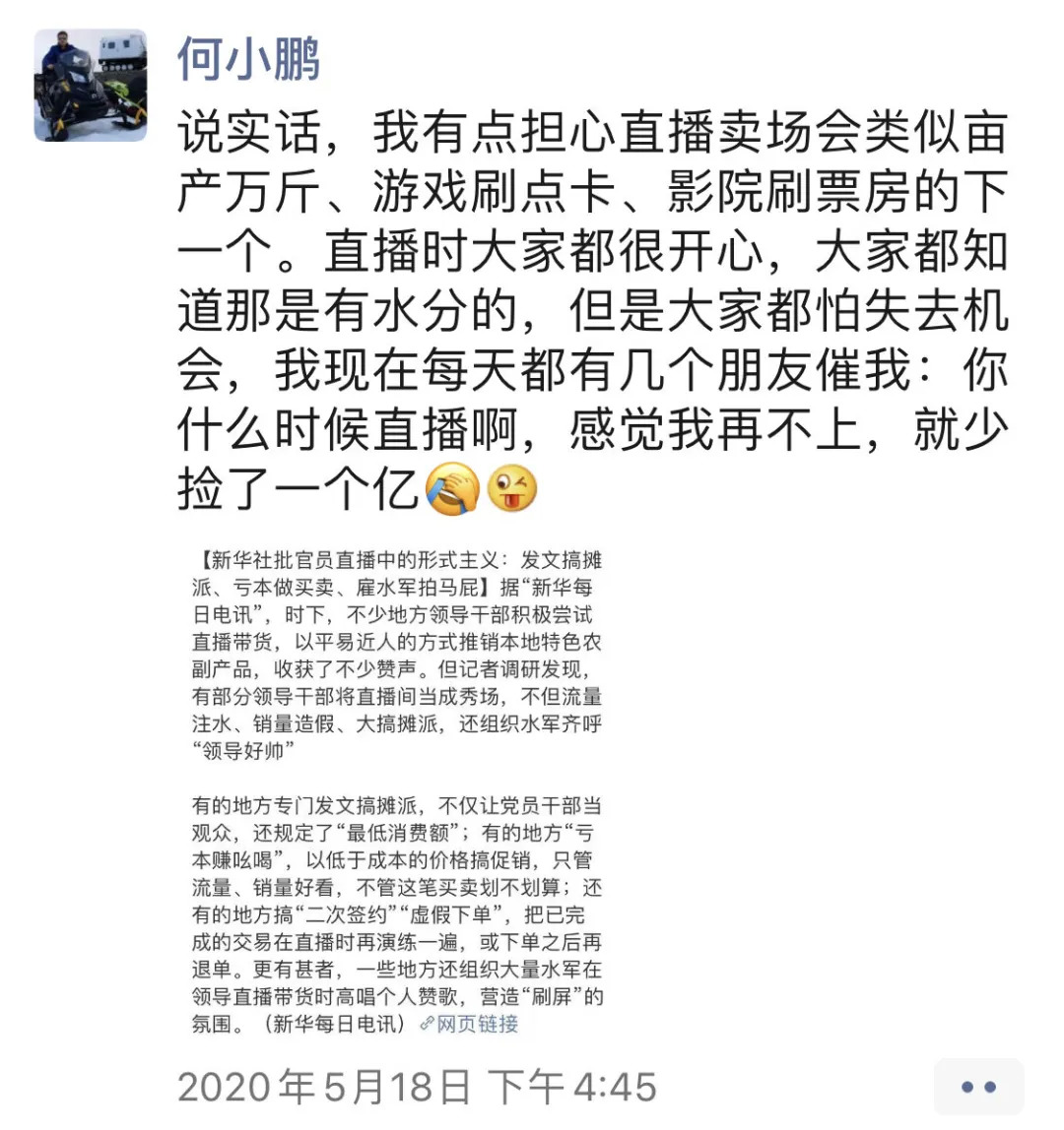 不过,刚刚结束连续21个月销量下滑的汽车行业比其他行业来得更加焦虑。新晋车企大佬何小鹏就不无忧虑地打趣说,担心直播卖场会类似亩产万斤的下一个。