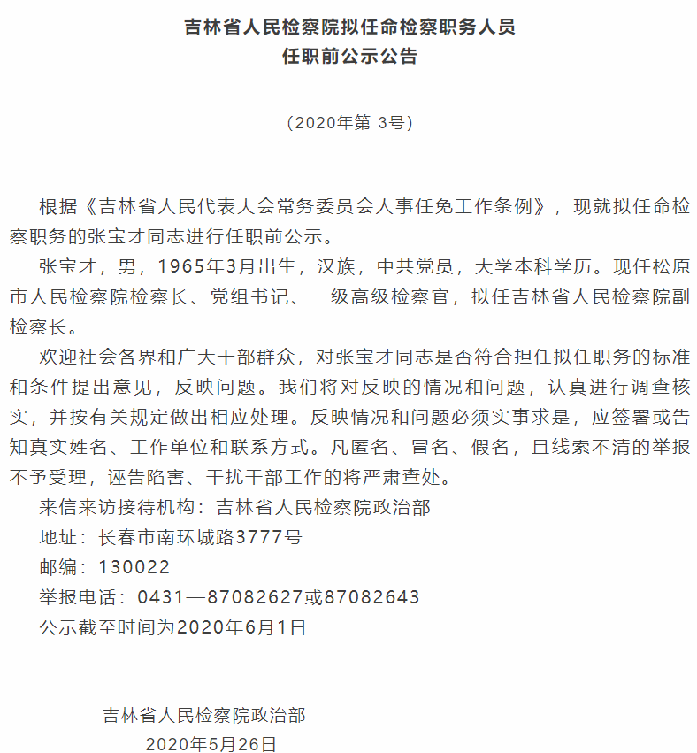 据吉林检察官方微信公号5月26日消息,根据《吉林省人民代表大会常务委员会人事任免工作条例》,现就拟任命检察职务的张宝才同志进行任职前公示,公示截至时间为2020年6月1日。