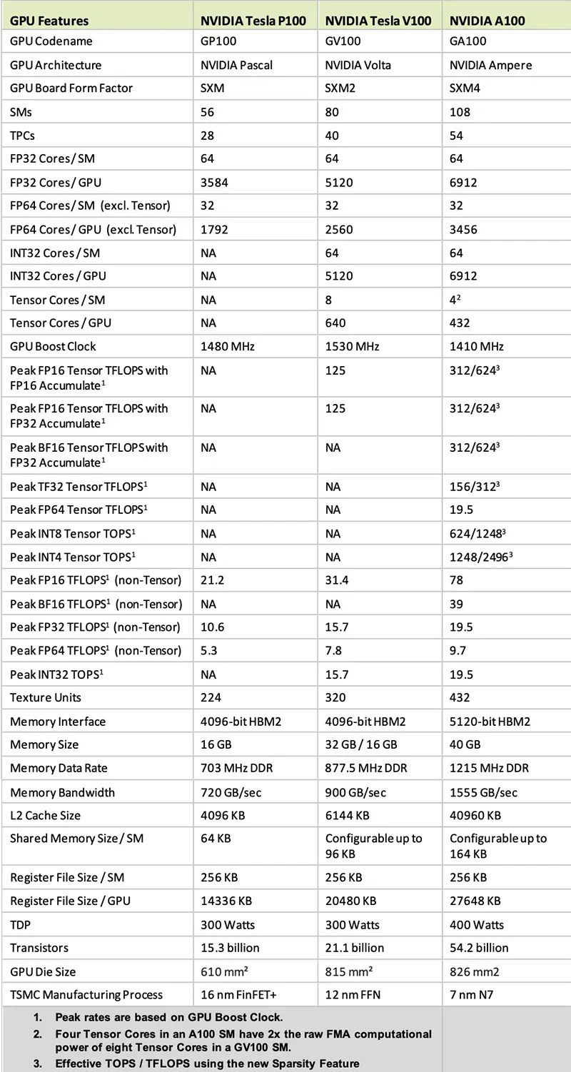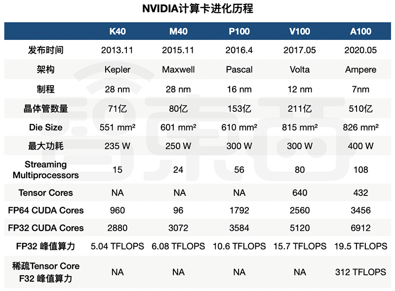 M40 GPU与K40间隔两年,P100与M40间隔半年,V100与P100间隔一年,A100又与V100间隔三年。