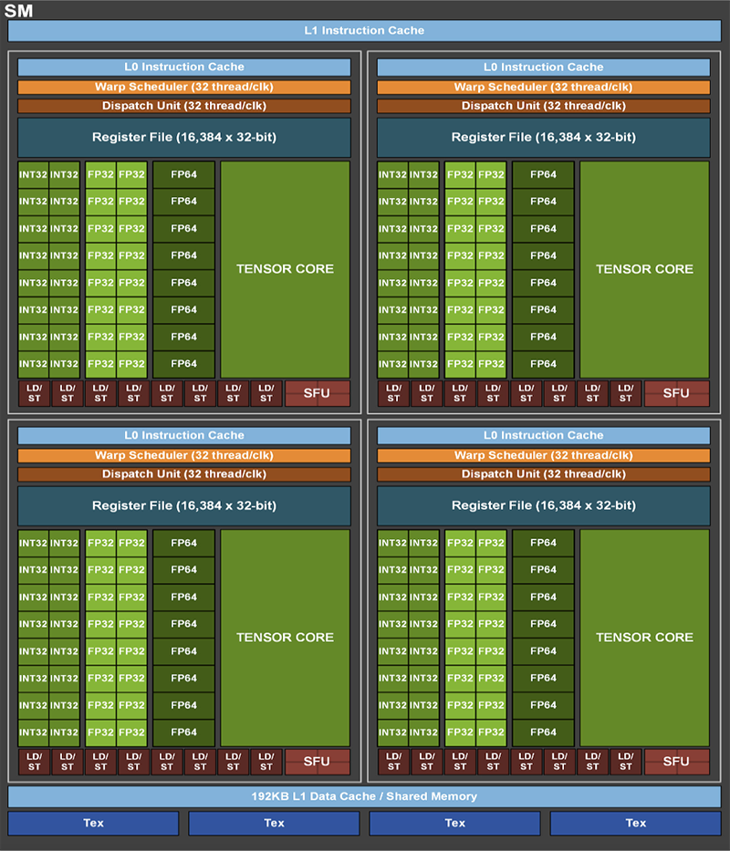 每个SM中的L1 cache和shared memory单元总容量达192 KB,是此前V100的1.5倍。