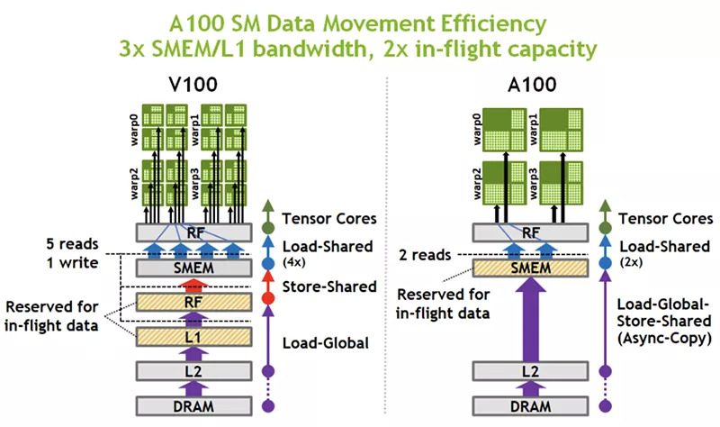 A100上的双精度矩阵乘法加法指令取代了V100上的8条DFMA指令,减少了指令取用、调度开销、寄存器读取、数据路径功率和shared memory读取带宽。