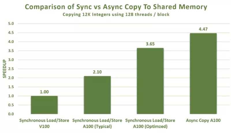 CUDA 11中还包含一个新的异步复制指令,可选择绕过L1 cache和寄存器文件(RF),直接将数据从global memory异步复制加载到shared memory中,从而显著提高内存复制性能,有效利用内存带宽并降低功耗。