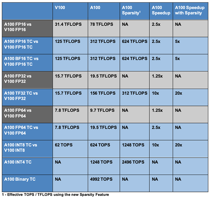 经结构化稀疏的A100 TF32 Tensor Core深度学习训练算力最高达到312 TFLOPS,是V100 INT8峰值训练速度15.7 TFLOPS的20倍。