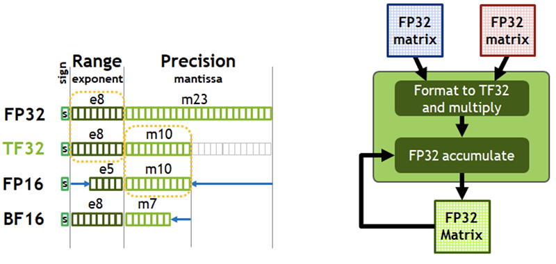 FP32是当前深度学习训练和推理中最常用的格式,而TF32的工作方式与FP32相似,TF32 Tensor Core根据FP32数据的输入转换成TF32格式后进行运算,最后输出FP32格式的结果。