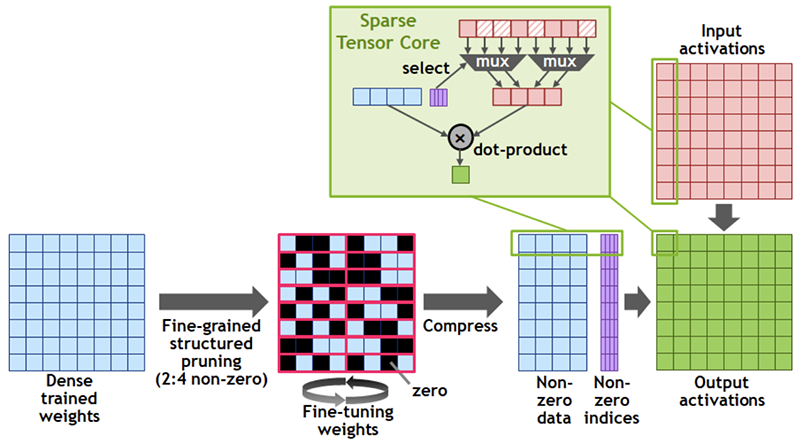 该方法首先使用密集的权重训练网络,然后引入2:4细粒度结构稀疏模式进行剪枝,最后重新训练,然后重复训练步骤,采用和之前训练相同的超参数、初始化权重和零模式。