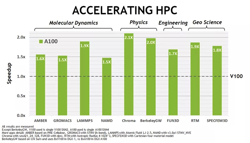 A100同时可提供训练、推理和数据分析,把AI训练和推理的算力提升到上一代V100的20倍,把HPC性能提升到V100的2.5倍。