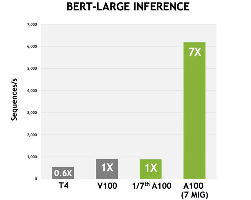 如果将A100分成7个GPU实例,1个GPU实例的算力约等同于一颗V100,也就是说A100能提供相当于V100的7倍的计算资源。