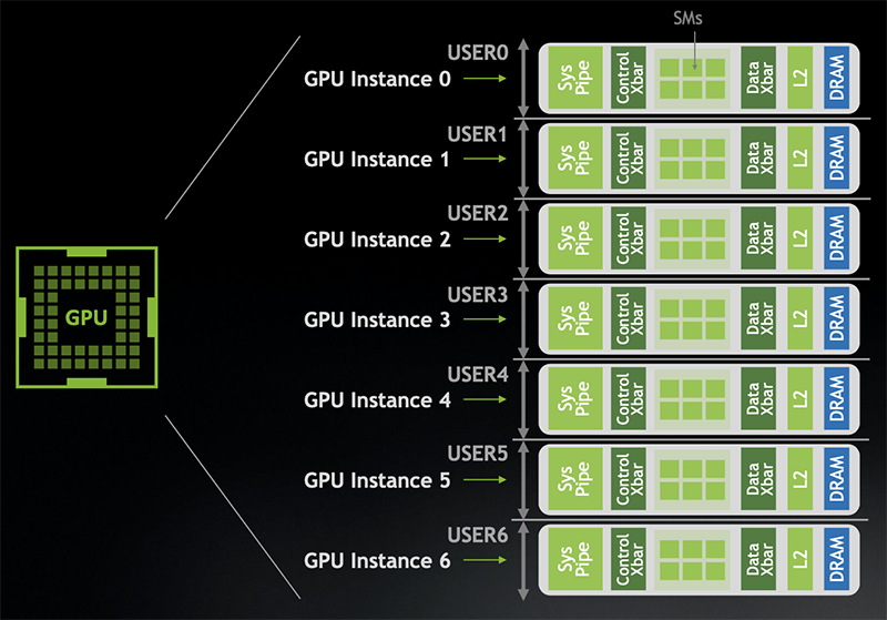 A100是第一个内置弹性计算技术的多实例GPU(MIG,Multi-Instance GPU)。