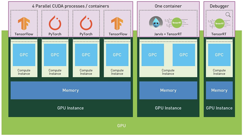 此外,CUDA编程模式没有变化,容器中的AI模型和HPC应用可通过NVIDIA Container Runtime直接在MIG实例上运行。