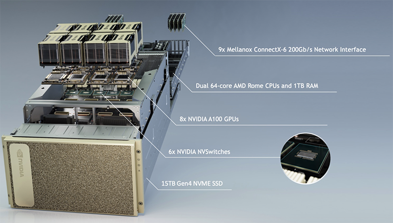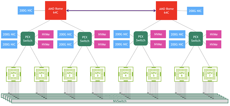 以DGX A100为例,该设备中采用AMD Rome CPU、8颗A100 GPU、6颗NVSwitch芯片,9个Mellanox ConnectX-6 200Gb/s网络接口。