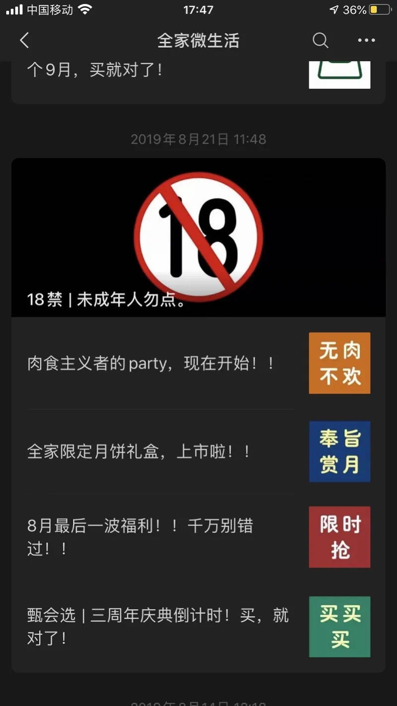 这并不是全家微信公众号第一次因为擦边球或标题党而引起消费者不满。从微博的消费者评论中发现,全家过去的公众号头条就曾有过一些“18禁未成年人勿点”等擦边球内容的标题,但内容却是正常的宣传促销。