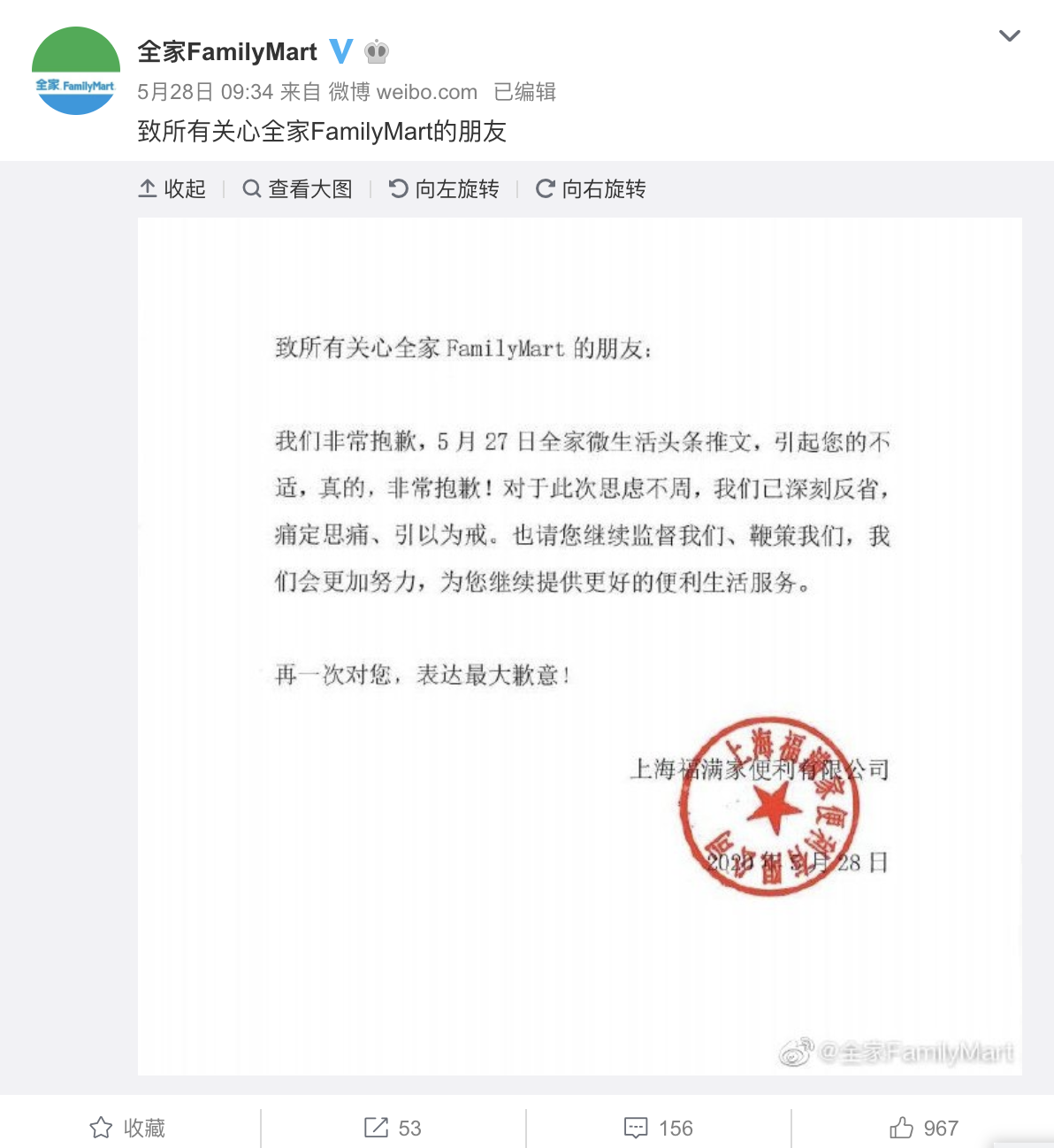 这一做法引起一些消费者反感,也有人在微信后台投诉全家公众号的这条推送。昨天,全家在微博发布道歉信,表示“思虑不周、深刻反省”。