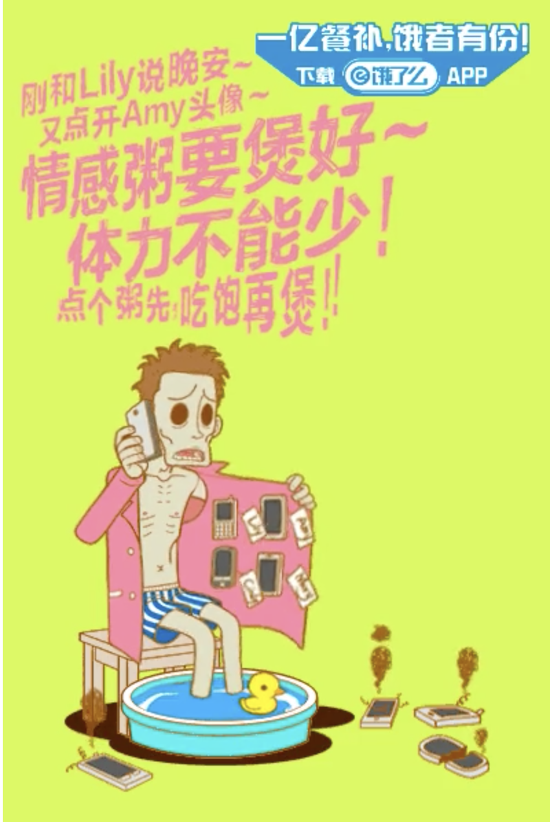 比如绝味的“鲜嫩多汁”,杜蕾斯的“你唇上始终有我的芝士”等等。饿了么早年的校园宣传也有过类似的暗示——男大学生给不同的女性打电话,文案是“体力不能少,点个粥先,吃饱再煲”。