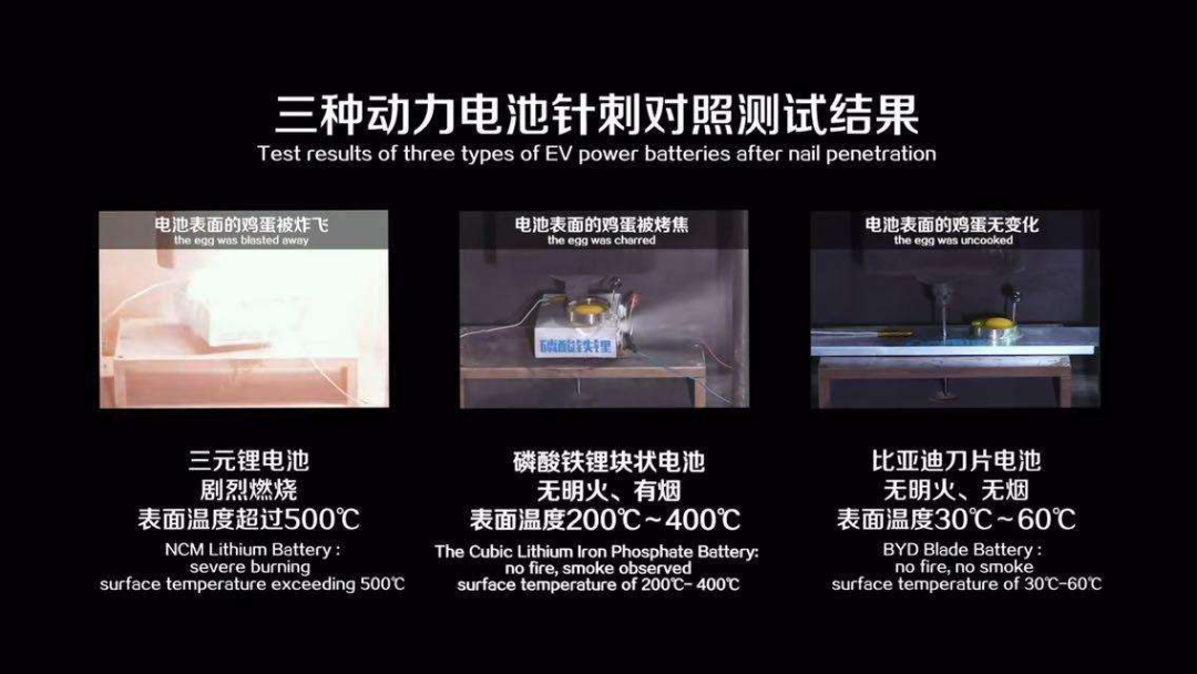当时,为了体现出刀片电池的极致安全,比亚迪特意在发布会上放了一个对比的针刺实验视频。在视频中,作为对照组的三元锂电芯在针刺后起火爆燃,而采用磷酸铁锂材料的刀片电池表示毫无感觉。