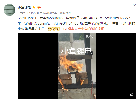 一家自媒体自行购入了宁德时代NCM811电芯,进行了非标准的针刺实验,电芯毫不意外地爆燃了。该媒体上传至微博的视频很快引发吃瓜群众的关注,纷纷@宁德时代。