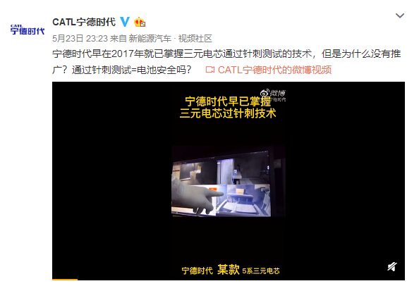 宁德时代官微再发视频,表示已掌握三元锂电芯通过针刺实验的技术,指明某5系及8系产品满足要求(但并未表明是否量产)。支持者留言称,(宁德时代此举)“成功打脸”。