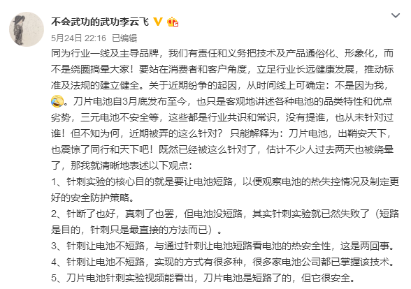 当晚,李云飞在微博再度发声,对宁德时代的针刺实验操作方法提出质疑,围观者众。