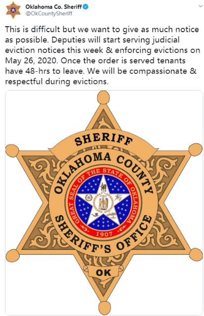 △俄克拉荷马县警察局在社交媒体通知将根据法院判决驱离拖欠房租的租客