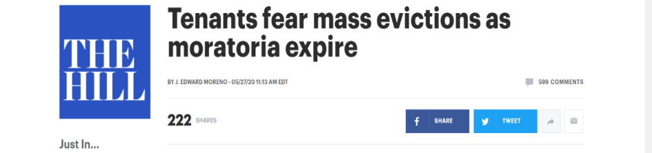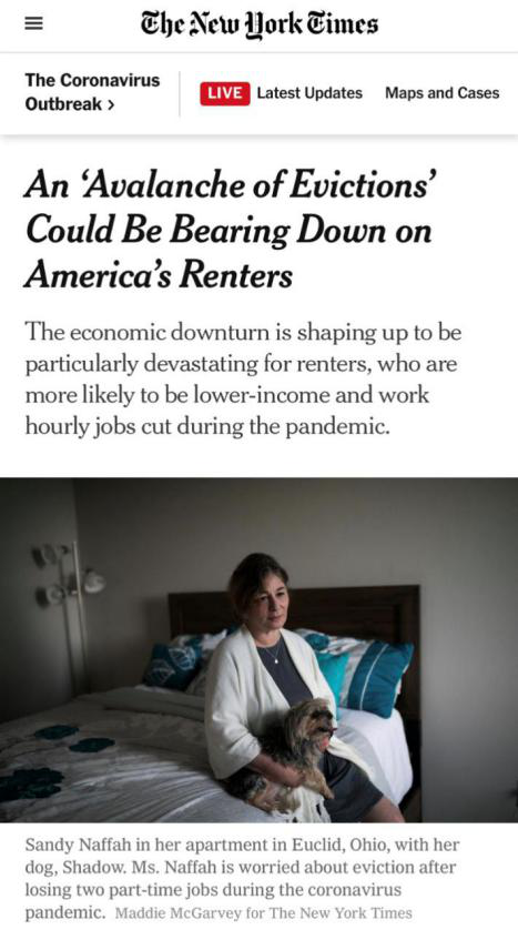 《纽约时报》在5月27日的一篇文章中称,疫情导致的经济下滑对低收入者和临时工类的租户影响严重。政府的救济金有限,如果禁止驱离的法律再失效,那么这些人将没有任何选择的余地。