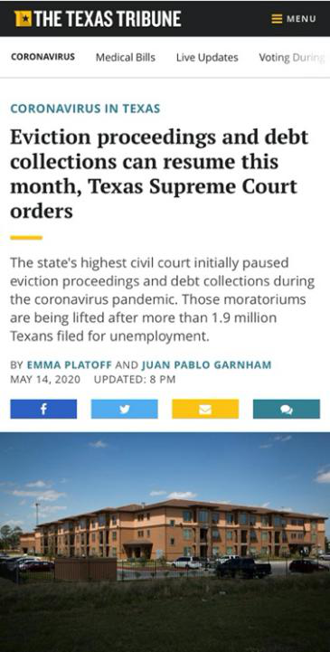 《得州论坛报》5月14日就报道,得州被驱逐的租客数量将会激增,尽管部分城市政府提供租金援助计划,但是无法满足巨大的需求,并且在州一级政府并没有类似的统一政策。游说组织得州住宅(Texas Housers)副主任克里斯蒂娜·罗萨莱斯表示,得州低收入人群的住房安全受到严重威胁,她担心无家可归的情况将会增加。“租客被驱逐还将导致严重的社会问题,一方面租客的生活质量势必将下降,房东也将由于房屋空置而减少收入,而无家可归者将给社会安全带来不安全因素。”得州法律中心退伍军人法律援助律师威廉·里特接受采访时称:“一名退伍军人向我哭诉,由于疫情拖延房租,他将被物业公司告上法庭。”