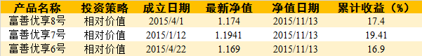 “富善优享”系列产品是该公司自2014年4月份起陆续发行的产品。其首支产品“富善优享1号”于去年4月24日正式运行,目前累计收益为36.90%。在今年,该系列新发“富善优享6、7、8号”,截至目前也均收获了15%以上的收益。其中,成立期最近的“富善优享6”号在半年的运行期中收益已累计达16.9%。这支今年4月22日运行的产品不仅扛住了股市大跌,而且净值处于稳步上升趋势。截至11月13日,该支产品最新净值为1.1690元。