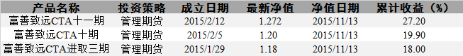 在富善今年新发行的产品中,几只CTA策略(管理期货策略))产品比较受人关注。9月2日,中金所推出了严厉的期指管控措施,以打击过度投机,因此,股指期货将无法成为对冲基金的工具。此时,CTA策略就开始被关注。富善投资总经理林成栋此前在接受媒体采访时表示,从今年6月份起富善投资就逐渐增加CTA产品的商品期货配置比例,且由于商品期货交易品种更多,可研发的新策略也会更多。到目前为止,今年上半年新成立的“富善致远CTA进取三期”、“富善致远CTA十期”、“富善致远CTA十一期”累计收益均超过15%,其中“富善致远CTA十一期”累计收益为27.20%,最新净值为1.2720元(11月13日)。