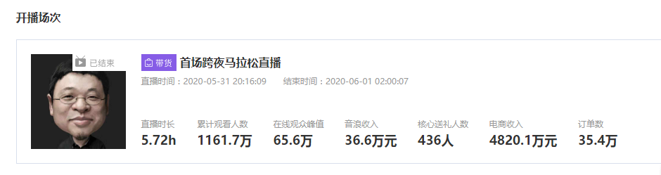 从4月1日首秀算起,老罗的直播卖货生涯刚好整整两个月。回想卖货首秀,老罗何等风光,3个小时就创造了支付交易总额突破1.1亿的记录,观看总人数超过4800万,光是直播打赏就收了363万。但自此之后,盛况难再续,新鲜劲一过,大家对老罗带货的关注度急剧下降。