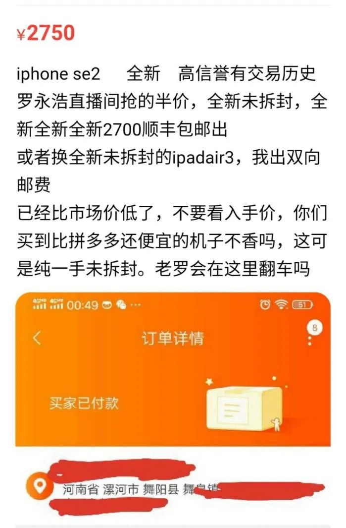 那么,这些半价iPhone被谁买走了?答案在二手交易平台浮出水面,打开咸鱼,晒半价iPhone SE订单的赫然在列,并普遍加价1000元以上,老罗千防万防,终究还是没防住羊毛党。