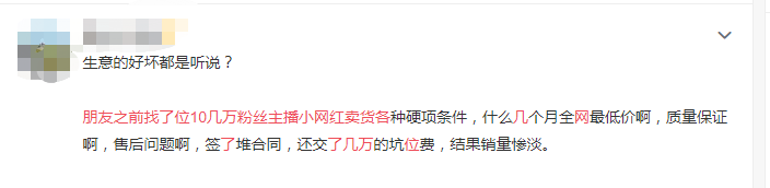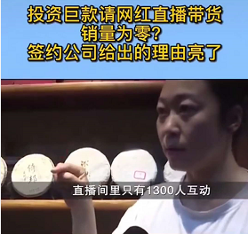 最近一家茶叶商因为直播带货损失惨重还上了热搜——投资5万给网红直播带货,却只得到挂零的惨淡销量,甚至还存在流量造假。商家介绍,“300多万粉丝的网红,场播费3万几,出货再拿提成,结果一件没有卖出去,在线人数只有1300多,还有我们公司100多人。”