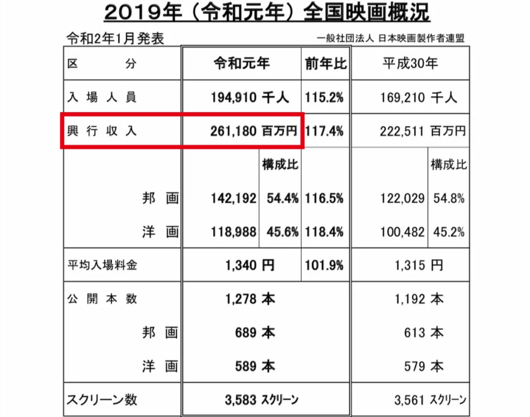 只要稍作对比便可以有清晰的概念,因为2019年日本全年的电影票房为2611亿日元(日本电影制片人协会公布的数据,约合172.7亿人民币)。换句话说,日本人民在电影院看电影所产生的票房和在网络上看电影或电视剧产生的效益几乎不相上下。