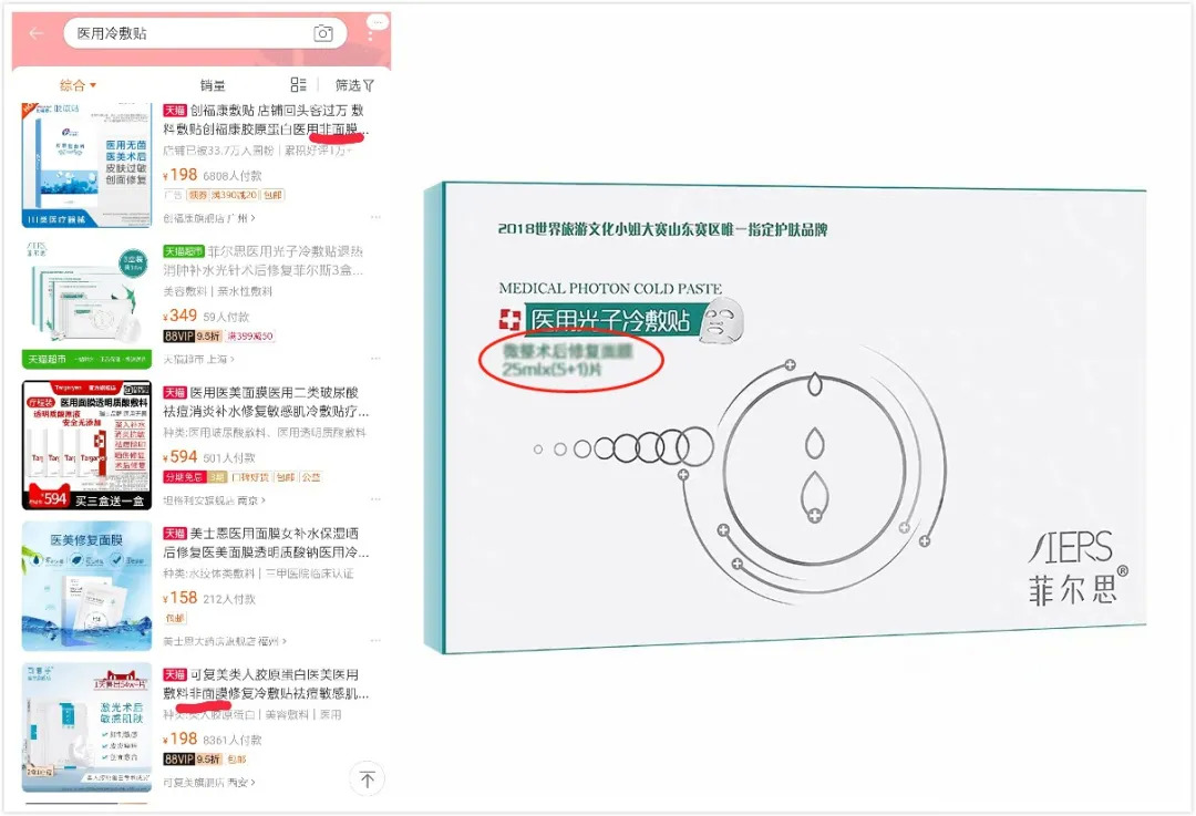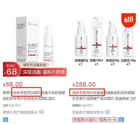 除此之外,青眼在线上各大平台发现,“械字号面膜”“医美面膜”等违规产品如今不仅未受影响,反而愈演愈烈,甚至衍生出了“械字号护肤品”。对比2019年“药妆”在被国家药监局盖章违法后迅速销声匿迹,为何以“械字号面膜”为首的 “械字号化妆品”依然活跃于市场?