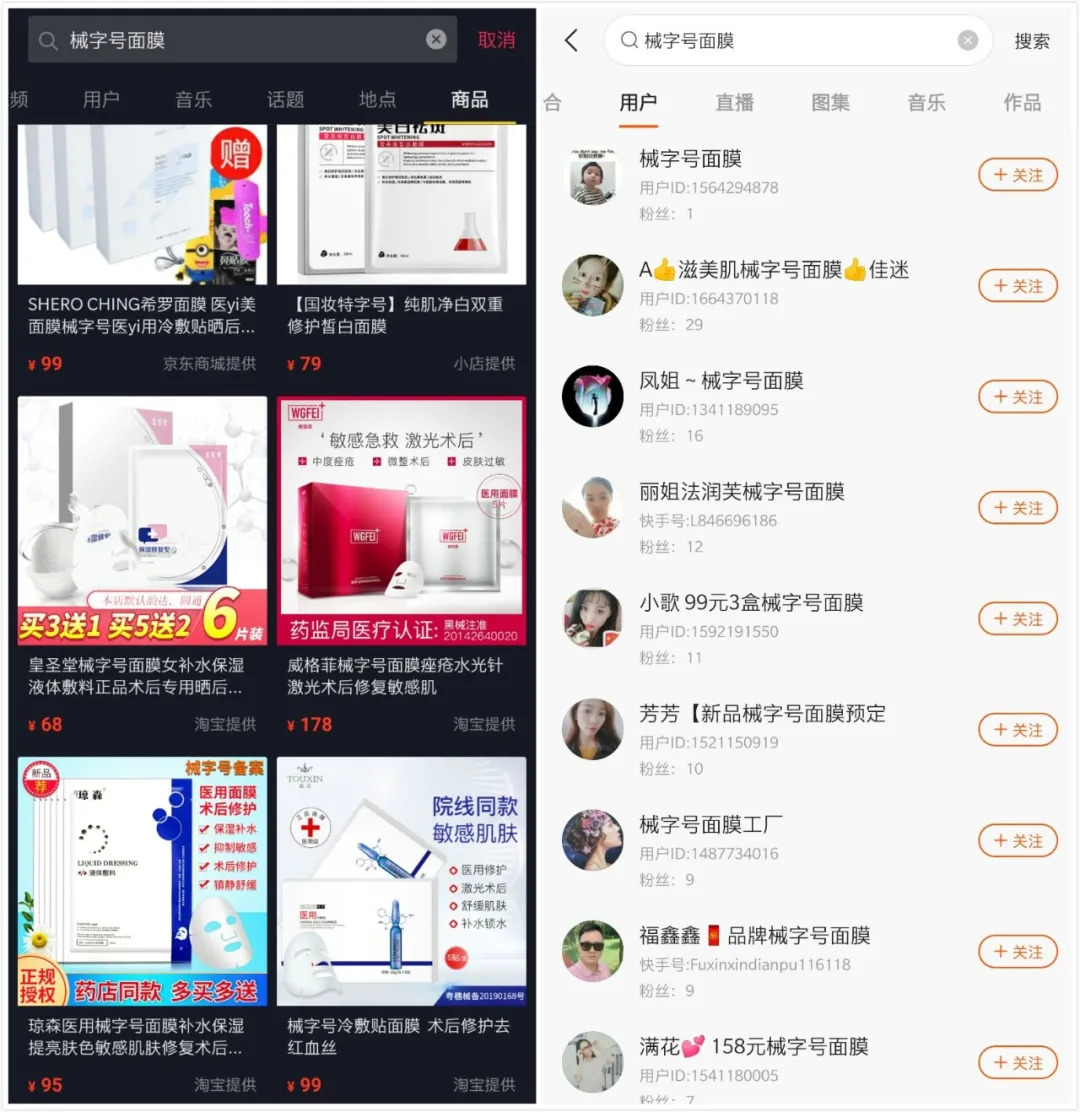 而抖音、快手更是助长“械字号面膜”的沃土。在抖音平台,“械字号面膜”相关商品数量众多,冷敷贴直接宣称“械字号面膜”更是常见操作。快手平台上,与“械字号面膜”相关的用户也不少,甚至还有人销售“99元3盒的械字号面膜”。