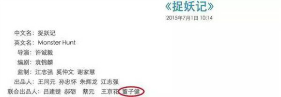 前段时间创造24亿票房传奇的《捉妖记》,联合出品人名单里居然也有董子健的名字?!