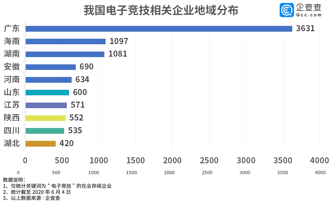从地域上看,虽然上海一直被公认为“电竞之都”,但企查查数据显示,拥有电竞企业最多的地方是广东,达到3631家企业,遥遥领先于其他地区,海南、湖南二省次之,而上海,仅拥有215家电竞企业。