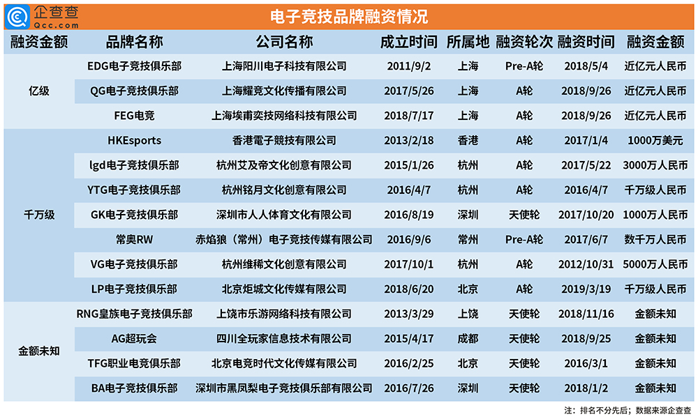 但“电竞之都”的头衔也不是空穴来风,除了在上海举办的各种全球顶级电竞赛事,众多头部俱乐部集结上海也是形势所驱。企查查整理的电子竞技品牌融资表显示,拥有千万级乃至上亿级融资的电竞俱乐部大多集中于北上广深等地。