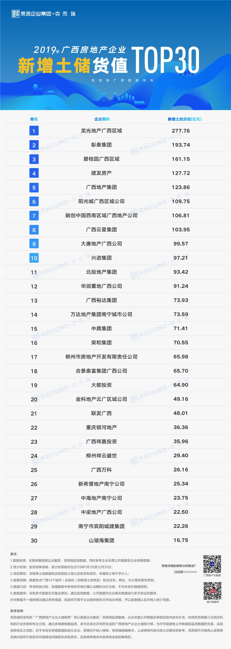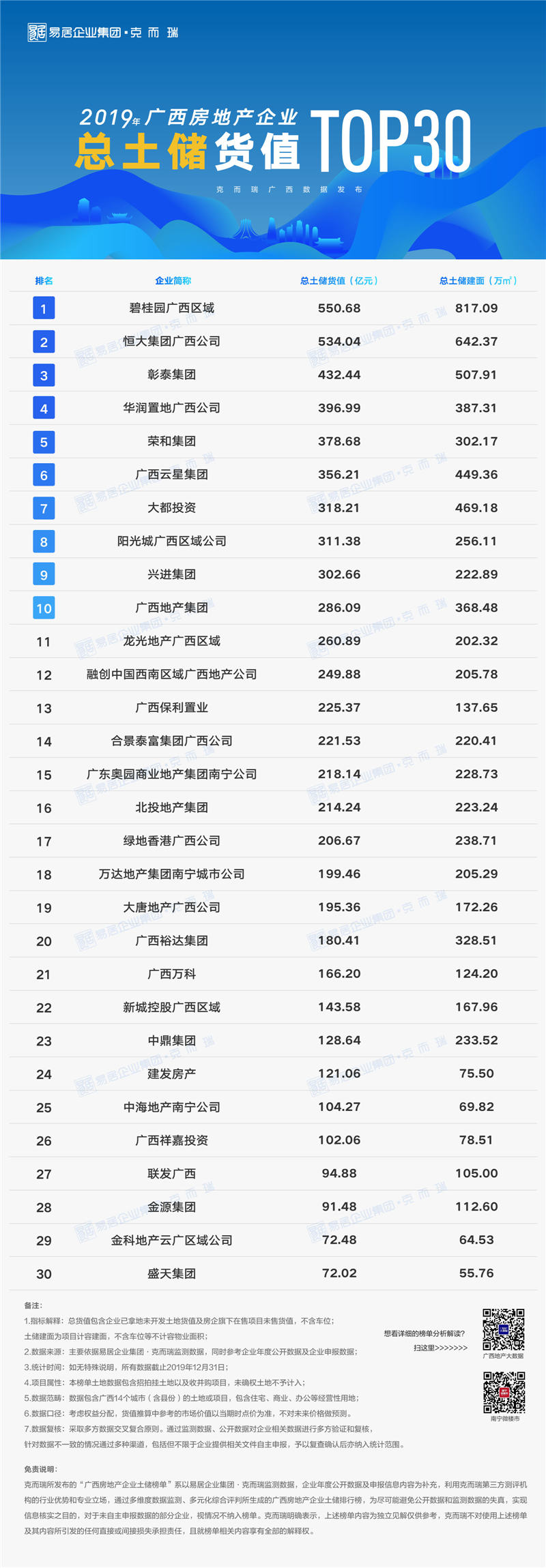 2019年广西房地产新增土储榜中,龙光、彰泰、碧桂园、建发、广西地产集团、阳光城、融创、云星均超百亿元;碧桂园、彰泰、龙光、云星、广西地产集团、融创、中鼎、北投地产集团、万达新增土储建面超百万平米;龙光、彰泰、建发、阳光城、碧桂园、华润置地、广西地产集团、大唐、兴进拿地金额都超过30亿元。
