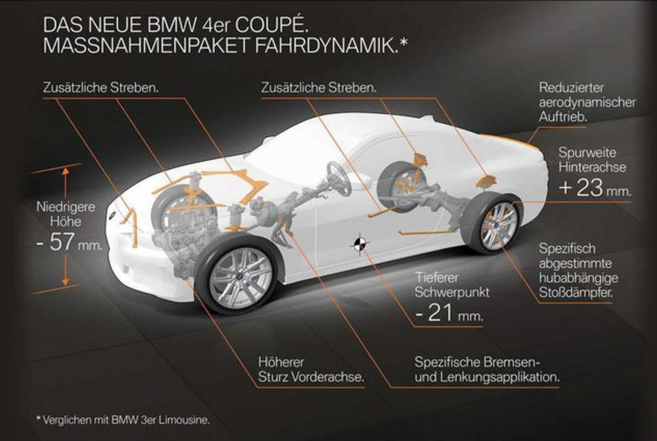 与前代车型相比,全新宝马4系双门轿跑车车身宽度增加27毫米,前轮距增加了26毫米,后轮距增加了19毫米,配合完美的50:50重量分布,提供了更加的操控灵活性和驾驶乐趣。同时,车辆前轮经特殊调教,前轮下方向外侧倾斜的角度更大,令车辆在加速过弯时能够更有效地传递横向控制力。