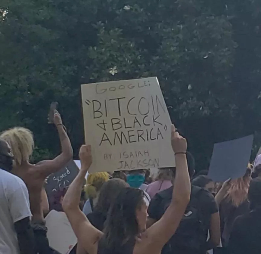 在北卡罗来纳州罗里市里,一名抗议者举着“Bitcoin and Black America(比特币与美国黑人)”的海报,引起了很多人的关注。其实,《Bitcoin and Black America》是Isaiah Jackson(赛亚·杰克逊)于去年7月发布的作品,该书深入分析了加密货币在给非洲裔美国人带来金融自主权方面所能发挥的作用。