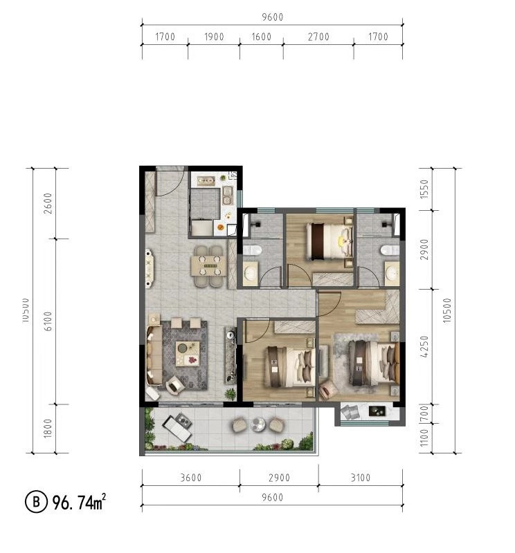 其中,【云熙】户型建面约96㎡,为三室两厅一厨两卫一阳台设计,采光度佳,通风良好,客厅+主卧+次卧三开间均朝南,小空间营造大格局。